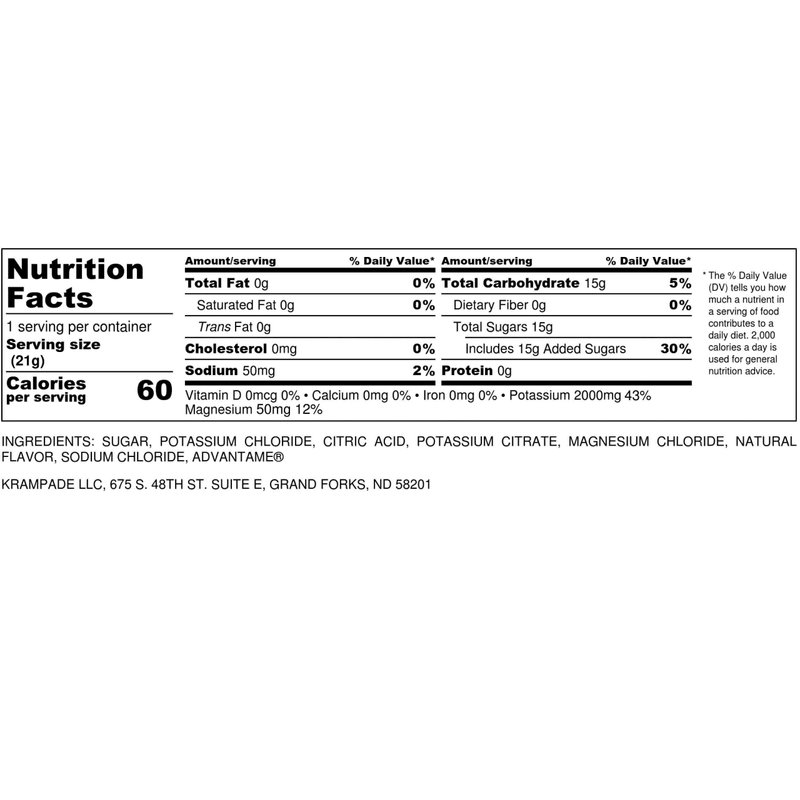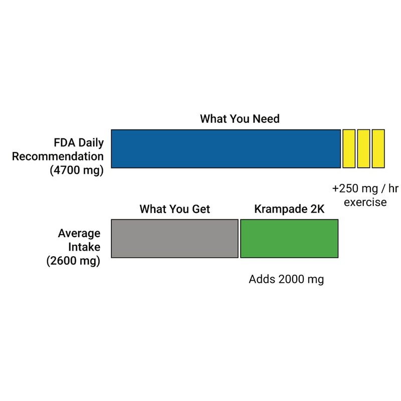 Imagine a world where the fear of a painful cramp is virtually unknown and where your sports drink makes a real, tangible difference you can feel instantly to energize your body. That world exists today with Krampade 2K 2.0. Krampade 2K 2.0 contains 2000 mg potassium synergized with 50 mg magnesium per serving and is designed to replace your current sports drink, potassium, and magnesium supplement. Krampade 2.0 magnesium/potassium is the optimal ratio for these electrolytes for effect and ease on the gut. This is the go-to product for most people to optimize their electrolyte balance and prevent cramps. It prevents cramps, improves hydration, increases endurance, and speeds your recovery. All cramps have the same physiology. Not enough potassium is left in the muscle to repolarize the cell and the muscle is left in the contracted state and cannot be controlled, aka a cramp. Krampade 2K 2.0 works to help prevent: Athletic cramps, Nighttime leg cramps, Heat cramps, Charlie horses, and Menstrual cramps. The high potassium and chloride improve hydration significantly. Insatiable thirst is simply due to not having enough potassium. During WW2, British soldiers stationed in Iraq drank lots of water and were still thirsty. The British Army determined that the problem was these men didn’t have enough potassium. Krampade is used by elite athletes all over the world. Krampade has radically improved their athletic performance. Players have reported up to a 70% reduction in measured water loss after they switched from a typical sports drink to Krampade. They also report much faster recovery, even during their games. What an edge to have over the competition, being physically and mentally fresher simply by having the ideal electrolyte mix of potassium, magnesium, and sodium of Krampade 2K 2.0 in your bottle.