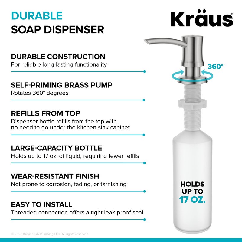 - UNIVERSAL DESIGN complements any decor style, coordinates with all Kraus kitchen faucets for a complete look – SPOT-FREE STAINLESS STEEL FINISH helps prevent water spots and fingerprints for easy maintenance, not prone to corrosion, fading, or tarnishing over time, and is easy to keep clean without the use of abrasive chemicals