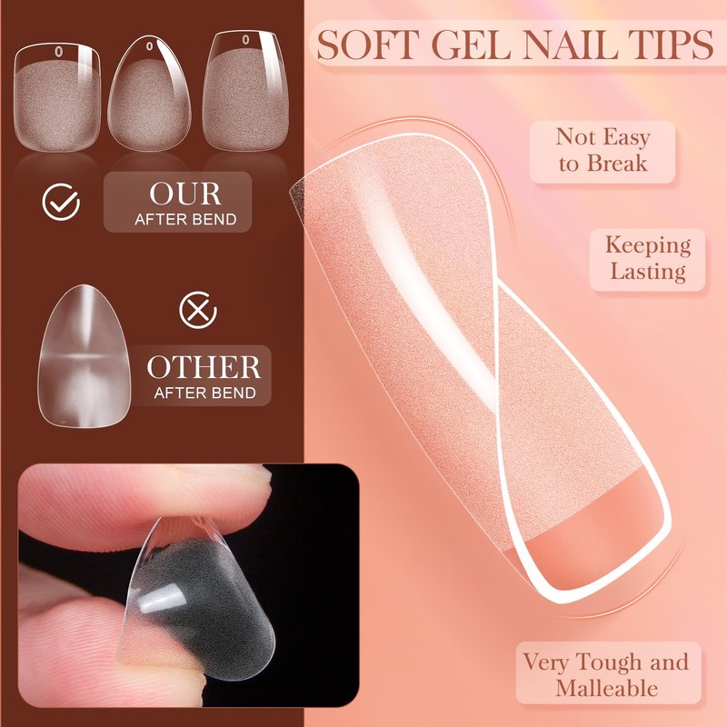 - 【Soft Gel Nail Tips】: krofaue soft gel nail tips is composed of soft gel material,thick in the front and thin in the back to fit the nature nail. Soft gel nail tips has good self-adhesive properties, which is very tough and malleable,not easy to break. Gel nail tips is easy to apply and remove, reducing damage to the nature nails. Thickness and firmness of short nail tips kit are sturdy enough to last about 2-3 weeks,soft gel false fake with a long service life.
