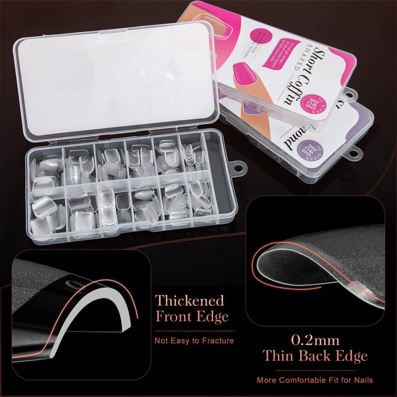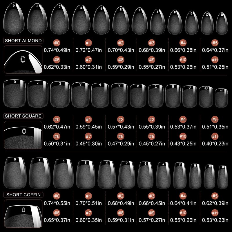 - 【Various Sizes】: There are 720PCS of three different short nail tips, including 240PCS of almond nails, square nail tips and coffin fake false, 12 sizes for each style; 3in1 nail tips set length is different, 3 styles false nail tips can meet your various needs; Combining various style of full nail tips kit brings convenience to you, saves your money and can make you try more design you like on different false nails.