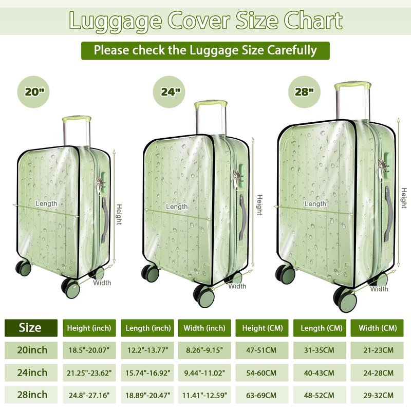 - 3 Piece Suitcase Cover: You will receive 3 luggage cover protectors, they are 20 inch suitcase protector( 19.68"H, 14.17"L, 8.66"W), 24 inch suitcase protector( 23.62"H, 16.53"L, 10.43"W), 28 inch suitcase protector( 27.56"H, 19.29"L, 11.41"W). NOTE: Please measure the size of your suitcase carefully before purchasing, if you are not sure about the size, please contact us in time, we will give you a satisfactory answer.