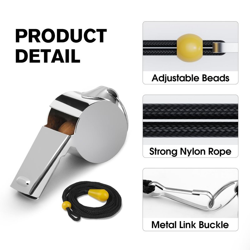 - Whistles with Lanyard: The coach whistles are equipped with black lanyards, which is made of nylon material, soft for long-time hanging in the neck. You can adjust the gold bead to control the length of the lanyard. Keep hands free in the activities or wear it on the wrist.