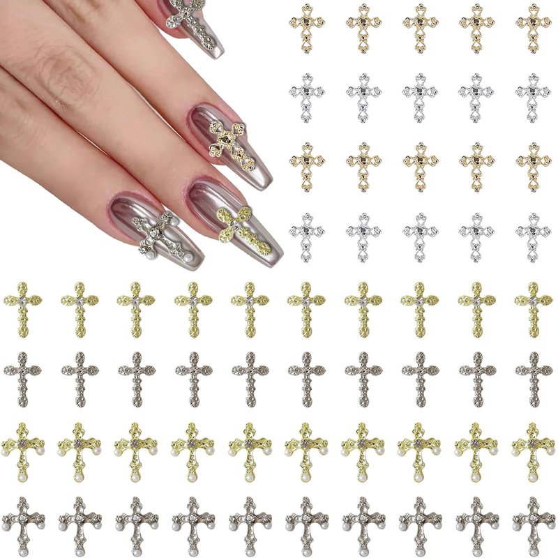 Kurilai 60pcs Cross Nail Charms for Acrylic Nails Accessories, 3D Cross Nail Decorations for Nail Art, Metal Pearl Gems Rhinestones Nail Decor for Women Girl DIY Jewelry Cellphone Crafts(Gold+Silver)