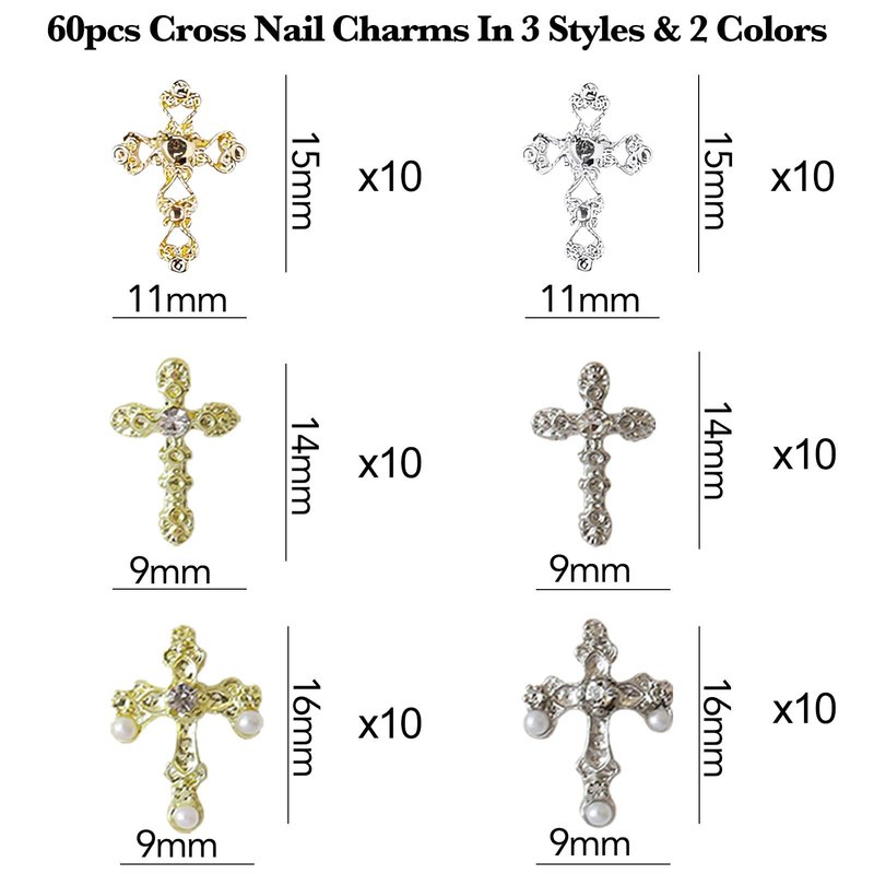 - 【Charming Cross Nail Charms Kit】The package contains 60 pieces 3D luxury cross nail art charms in 3 different styles and 2 color, 6 types in total, 10pcs of each type. Enough quantity will satisfy your daily design use and replace needs, keep your nails sparkling all the times.