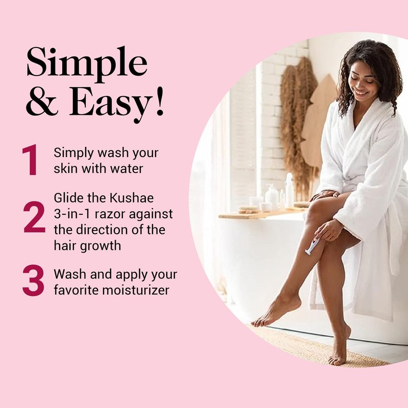 - Multi-Functional: The Kushae 3-N-1 razor for women is a versatile device that enables you to cleanse your skin, shave your body and bikini area, and shape your eyebrows with ease. With its 3 different tips, you can get it all done with one device!