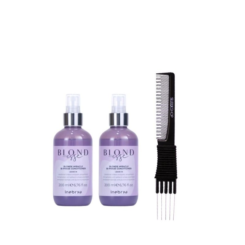 This kit includes a quantity of (1) Premium Carbon Heat-Resistant Multi-Use Teasing Comb which is an anti-static, lightweight, durable comb with specially designed grips for non-slip. This multi-purpose comb can also be used for braiding and teasing hair. 5 metal picns Inebrya Blondesse Blonde Miracle Bi-Phase Conditioner Blonde Miracle Bi-phase Conditioner is a leave-in bi-phase conditioner for impeccable and safe blonds. The hair will be protected, conditioned and deeply hydrated. The anti-yellow action enhances the cosmetic colour while the anti-pollution function protects it from external agents. Its precious formula is enriched with Aloe Vera, which helps maintain the hair healthy, protects it from breaking and prevents hair loss. Being a healing plant, it provides the right amount of mineral salts, amino acids and vitamins to make the hair brighter and shinier. The Purple Pigment, on the other hand, helps to neutralise unwanted yellow tones and enhance the cold tones, perfecting the blonde. Lastly, the Anti-Pollution Complex acts on the cuticle, protecting it from external agents, such as smog, fine dust and UV rays.