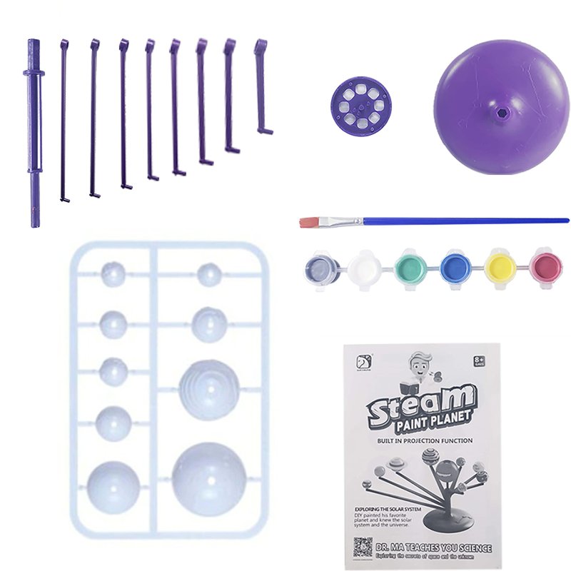 KUTOI Solar System Model Kit is a fun and exciting way to help your child learn about the planets in our solar system. This DIY, hands-on STEM science toy will stimulate a child’s curiosity and interest in astronomy while teaching them the names and configuration of the planets in their very own mini planetarium. Your child can use the included paint and brushes to create accurately detailed replicas of the 8 planets, while learning about their solar system. The sun has a built-in light source that allows for the image of a planet to be projected onto the ceiling, just flip the switch, insert the image disc and rotate through multiple planet images. Each planet in this model has an independent rod that rotates and allows your child to simulate the planet's location in the solar system and its actual trajectory, creating their own mini planetarium. Enrich your child's imagination and let them explore the wonders of the solar system. Through hours of creative play they will also be learning and enhancing their scientific cognition, logical thinking and more, all while enjoying watching the planets orbit around the illuminating sun.