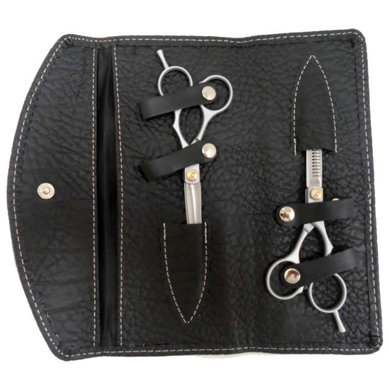 KUTZ Barber Scissors & Thinning Shears set, model SC-14904, offers a high-caliber combination that caters to every hair professional's needs. This set proudly presents a 5" (12.7 cm) barber scissor alongside a 5" (12.7 cm) thinning shear, each nestled in its snap-down section inside the custom-made carrying case. Crafted from brushed stainless steel, both the scissor and thinning shear ensure durability without the fear of rusting, offering a precise cut every time. The added brass tension control fine-tunes your cutting experience, guaranteeing unparalleled precision. Perfect for those with voluminous locks, the thinning shears effortlessly thin out dense hair. The carrying case is not only functional with snap closures and protective coverings for the scissor tips but also compact at 8.75" (22.2 cm) x 3.75" (9.5 cm) when folded. An additional compartment can be utilized for business cards or a petite appointment book to manage client schedules, enhancing the professional touch.