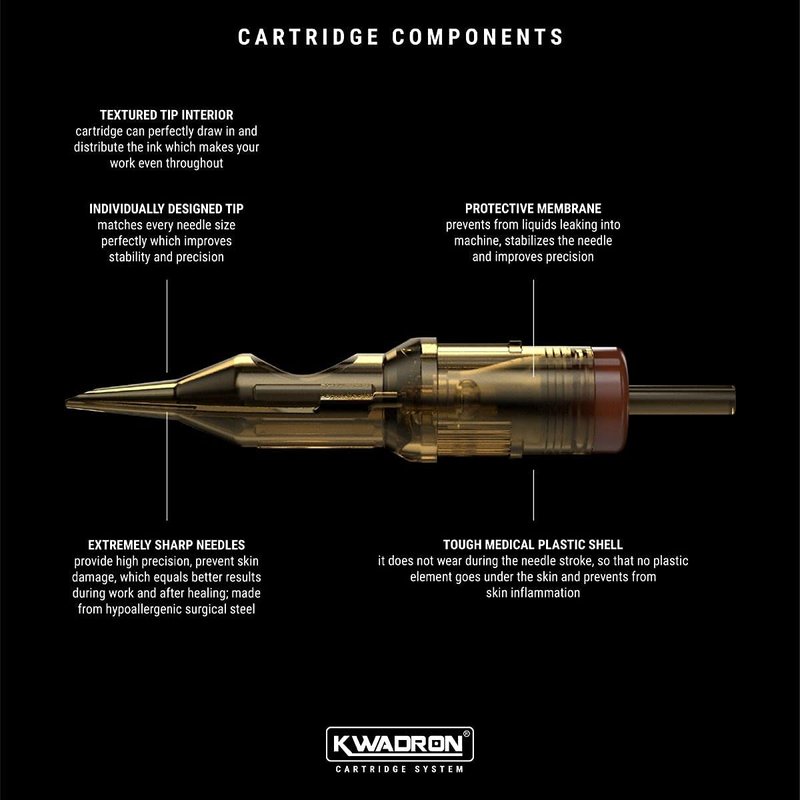 Box of 20 Cartridge Tattoo Needles by KwadronKwadron tattoo needles are known for being precisely made with high-quality materials for optimal performance.Kwadron cartridges boast a unique stabilizing system for optimal tattooing. The cartridges also employ a membrane-style system that protects from ink back flow. These cartridge tattoo needles are made with medical grade plastic housing, which helps reduce friction between the needle grouping and the tip. The surgical steel needles are razor-sharp and designed with utmost precision for every configuration.This listing is for one box of 20 Kwadron cartridge tattoo needles.