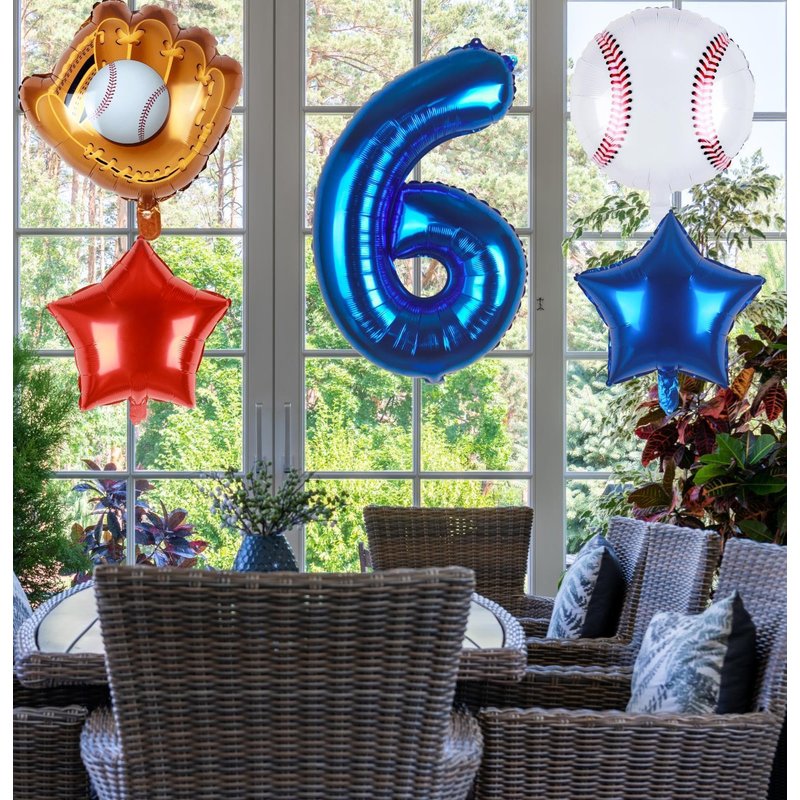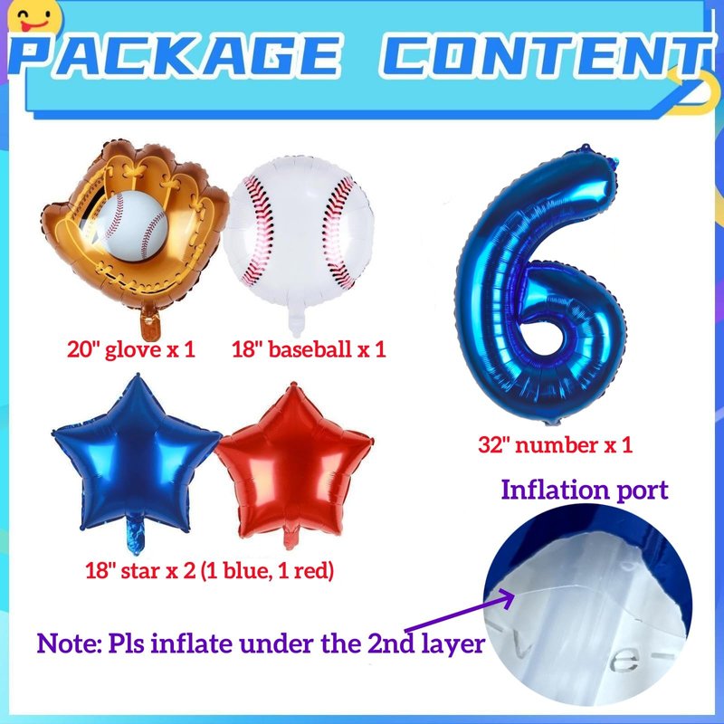 - 5PCS PACK | BASEBALL PARTY DECORATIONS: 32inch navy blue number 6 balloon x 1, 18inch foil baseball balloons x 1, 20inch baseball glove balloons x 1, 18inch star balloons (1 dark blue, 1 red), straw x 1, 32ft ribbon.