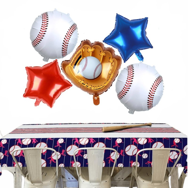 - 5PCS PACK | BASEBALL BIRTHDAY DECORATIONS: 20inch baseball glove balloons x 1, 18inch foil baseball balloons x 2, 18inch star balloons (1 dark blue, 1 red), straw x 1, 32ft ribbon.