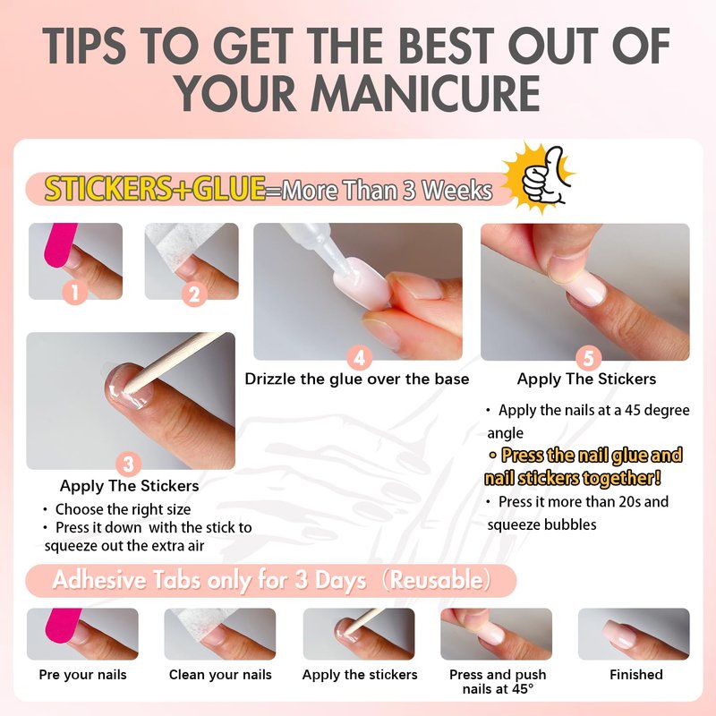 2.If you want it last for a longer time,please use nail glue instead of the nail stickers.