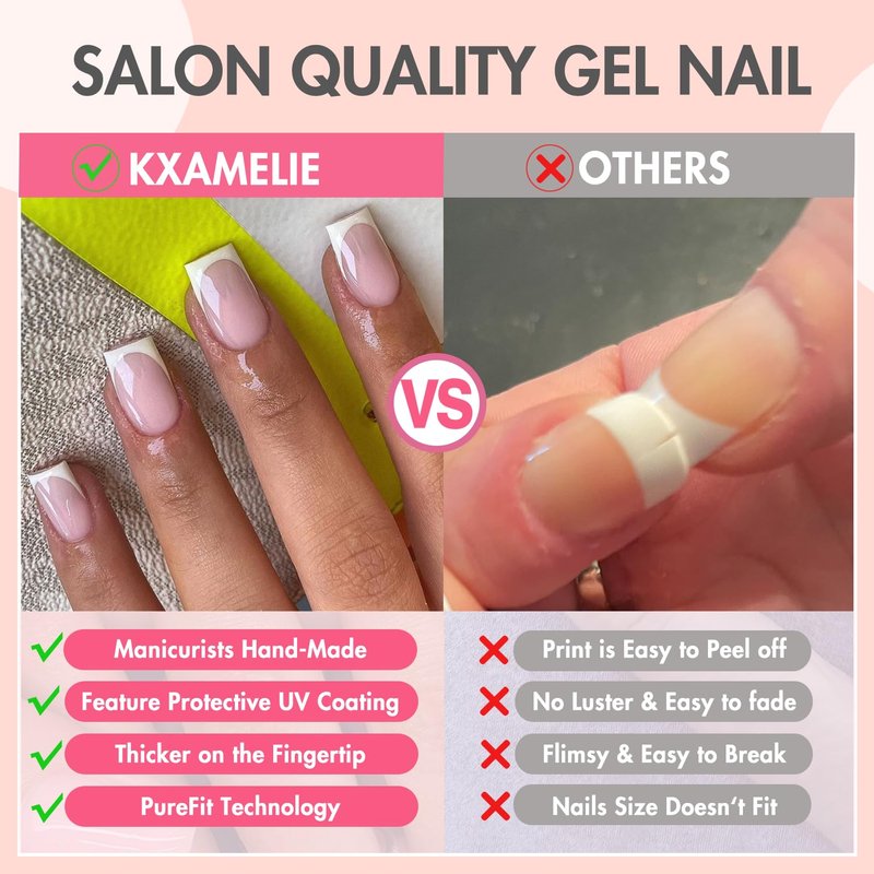 - ❀【Superior Quality & Long-Lasting Hold Press-on】Our stick on nails for women are known for their exceptional quality and durability.Gel x french tip nails set are designed to stay securely attached to the nails,offering a long-lasting hold that minimizes the risk of acrylic nails press on coming off unexpectedly.