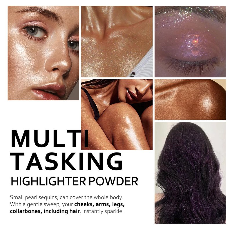 - 【Multi Tasking Highlighter Powder】Small pearl sequins, can cover the whole body. With a gentle sweep, your cheeks, arms, legs, collarbones, including hair, instantly sparkle. Natural sparkling finish, suitable for stage, party and concert multiple makeup. Easy and convenient to get a shiny natural gloss look.