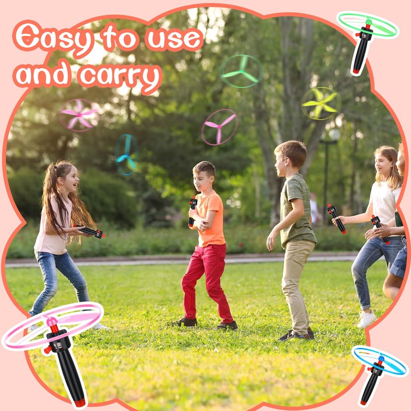 - Package Content: You will get 36 pieces of flying toys, composed of 12 string launchers and 24 flying saucers with 2 sizes (each launcher is equipped with 4 flying saucers colors), simple and interesting to play, enough quantity for you to share with playmates