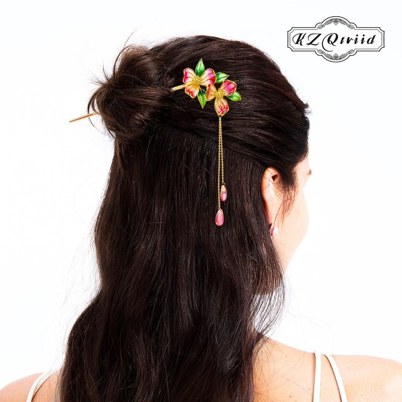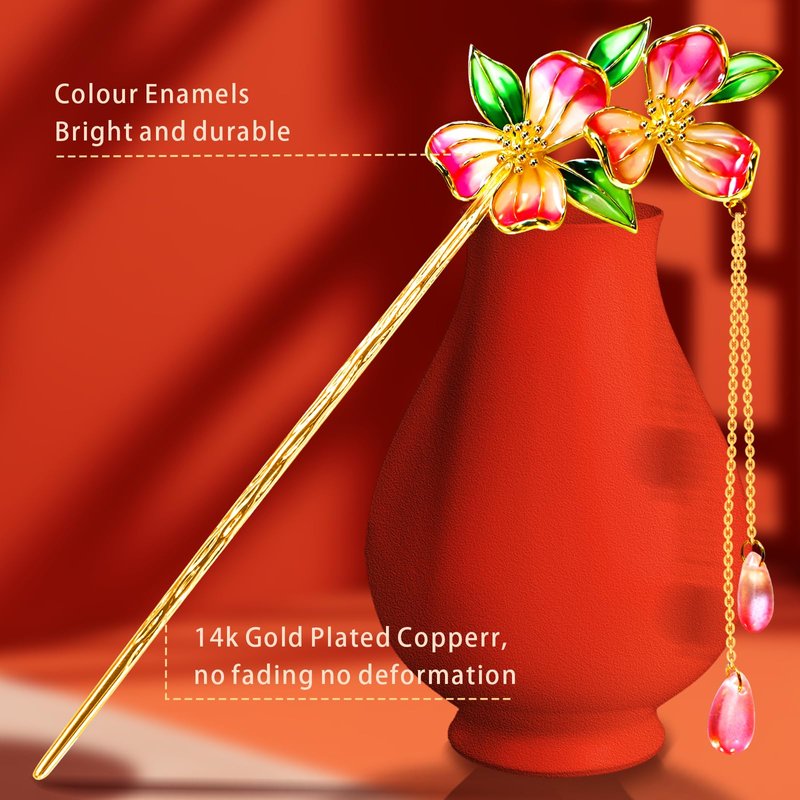 KZQtriid Hair Accessories 14k Gold Plated Copper Vintage Handcrafted Colour Enamels Peach Blossom Tassels Hair Stick ,Hair Clip. 7.08" Hair Chopsticks For Women.