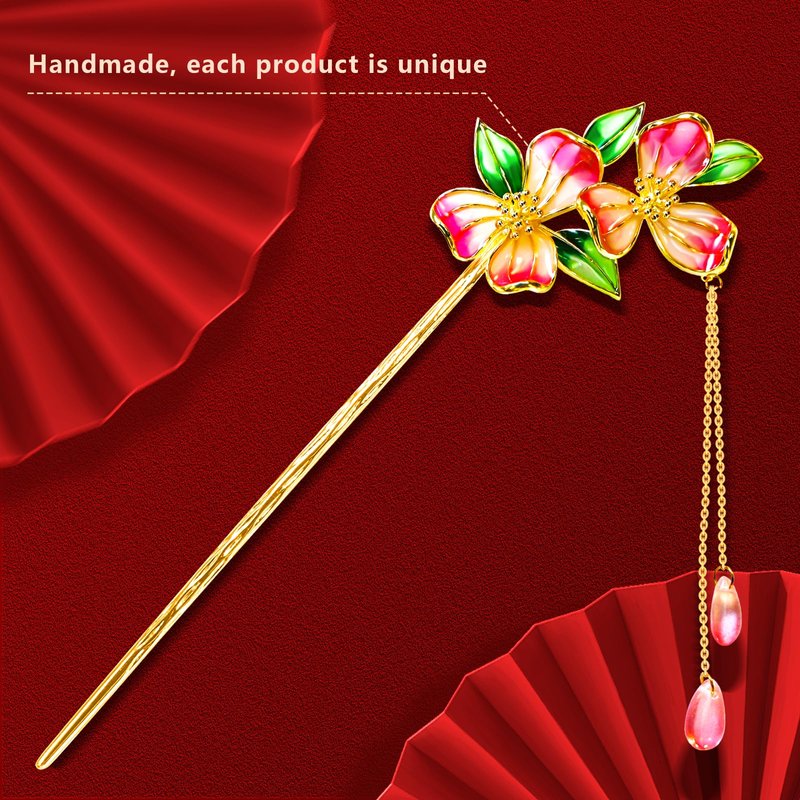 - Unique Hair Stick Design: Featuring vibrant colour enamels and charming peach blossom tassels, this hair stick is a stunning statement piece for any occasion.