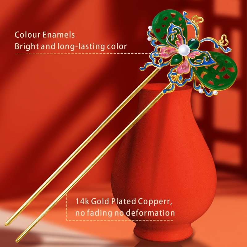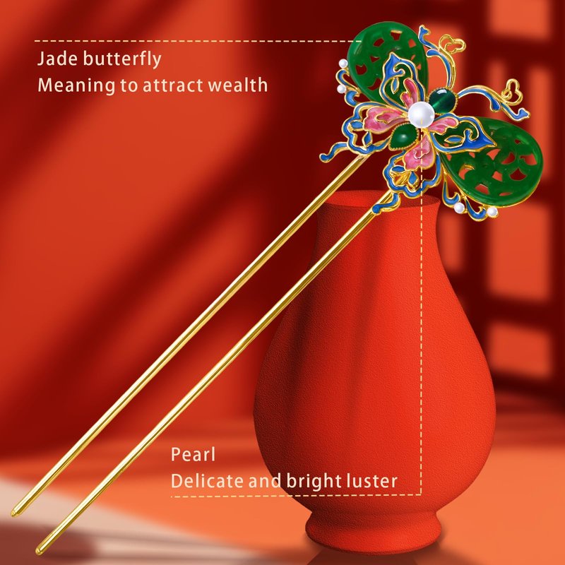 - Artistic Hair Stick Design: Featuring a unique jade butterfly U-shape, this hair stick showcases vibrant colour enamels that make a beautiful statement in any hairstyle.