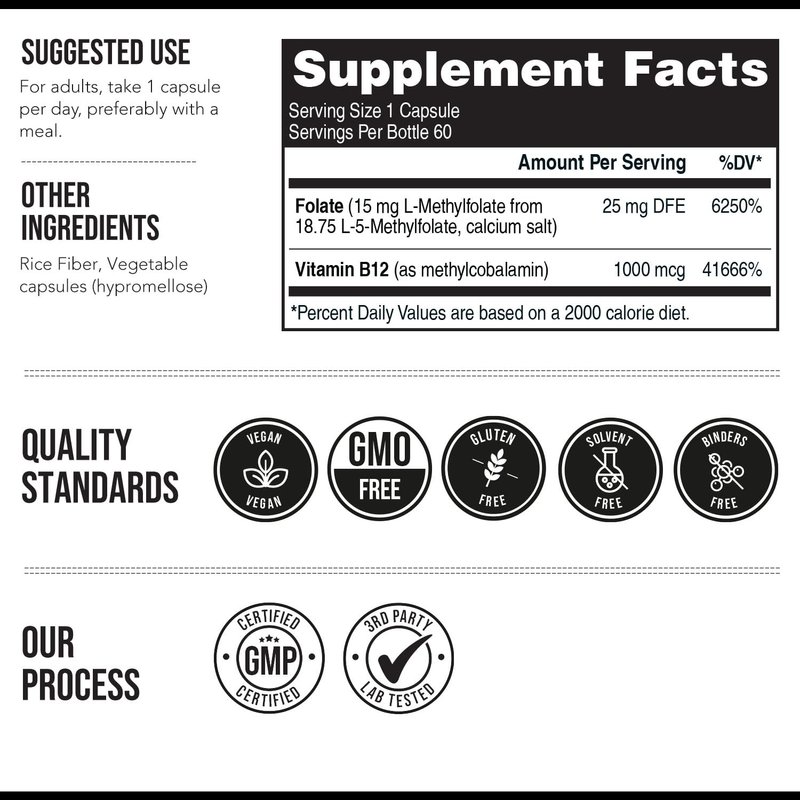 L Methyl Folate 15mg Plus Methyl B12 Cofactor – High Potency, Active 5-MTHF Form - Supports Mood, Methylation, Cognition – Bioactive Forms of Vitamin B9 & B12 (60 Capsules – 60 Servings)