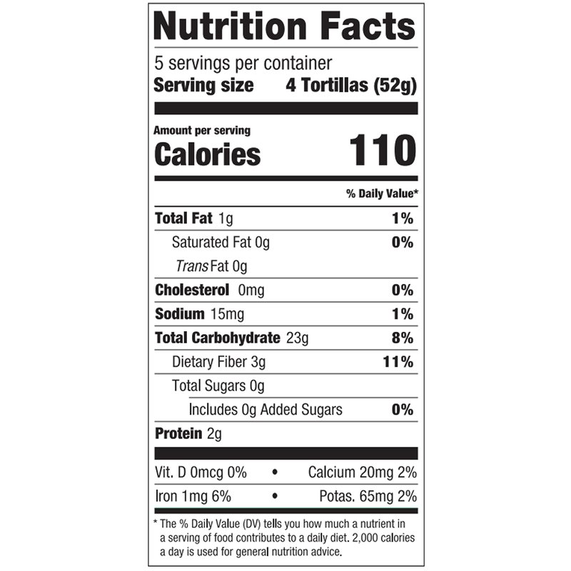 - Serving Size (4) Tortillas: 110 Calories