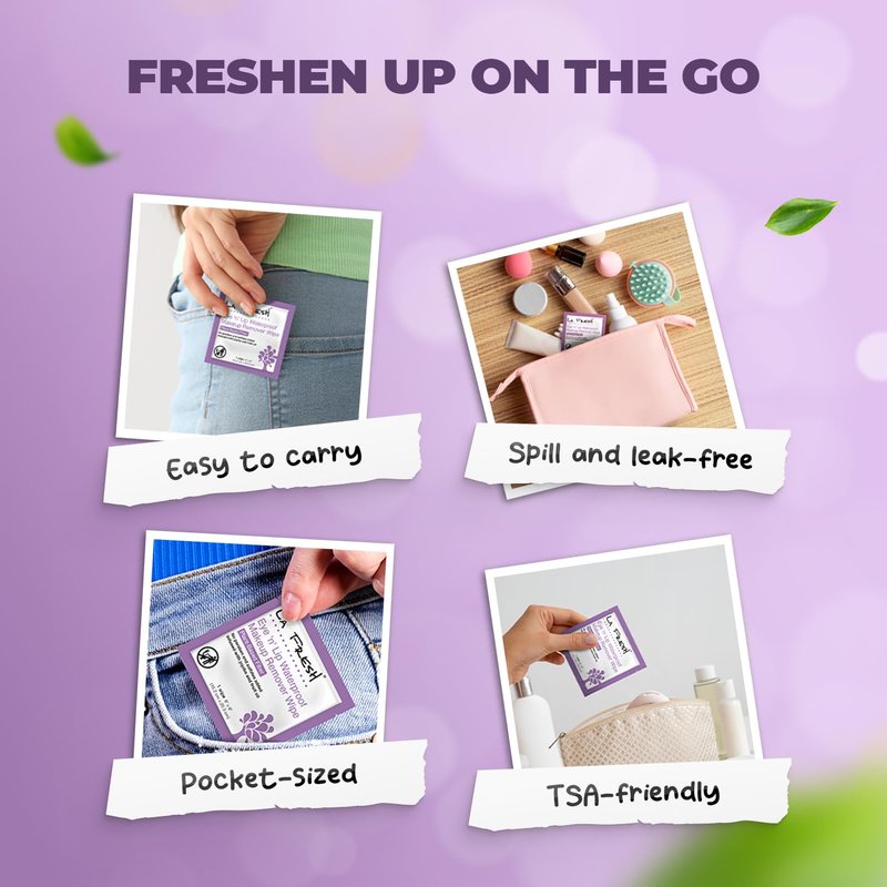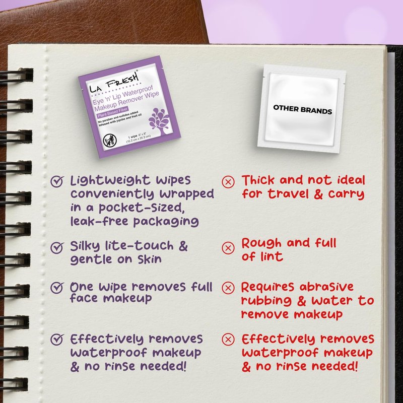 LA Fresh Eye and Lip Waterproof Makeup Remover Wipes Pack of 50 Individually Wrapped Wipes Made With Vitamin E, Olive Oil Convenient Size For Purse, Gym Bag, Car, Anywhere On The Go