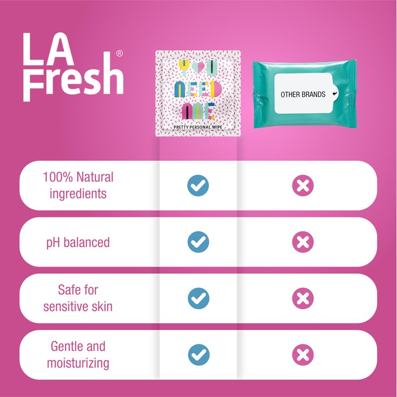 - Refreshes down there - Feel revitalized with LA Fresh feminine wipes for women. Our intimate wipes boost confidence, fight bad smells and itchiness with aloe vera, chamomile, and cucumber extracts.