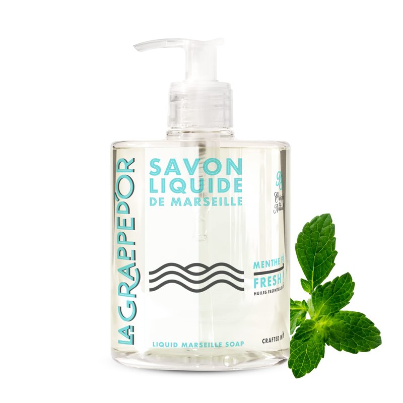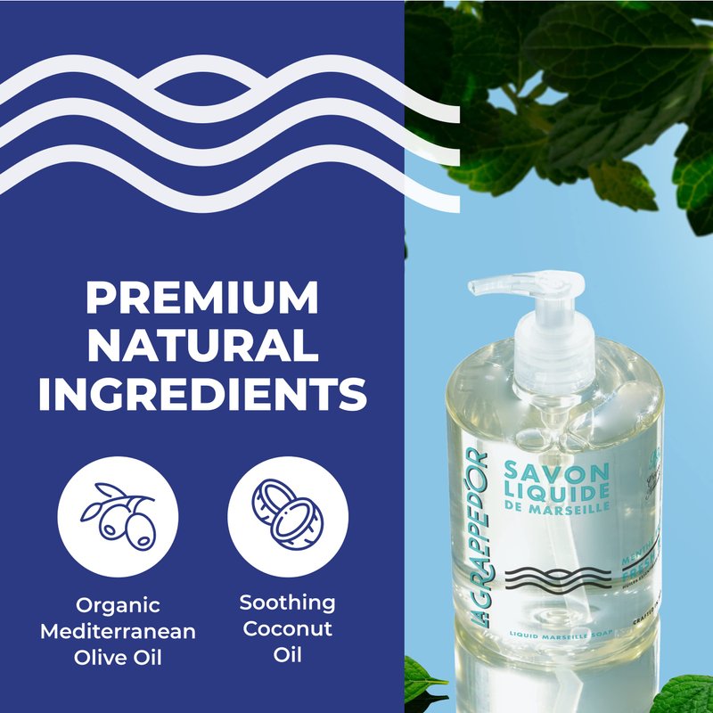 La Grappe d'Or Fresh Mint Marseille Hand Soap with Essential Oils | Handmade in France from Moisturizing Organic Olive & Coconut Oil | Natural, Cruelty-Free & Vegan, 16.90 oz Liquid