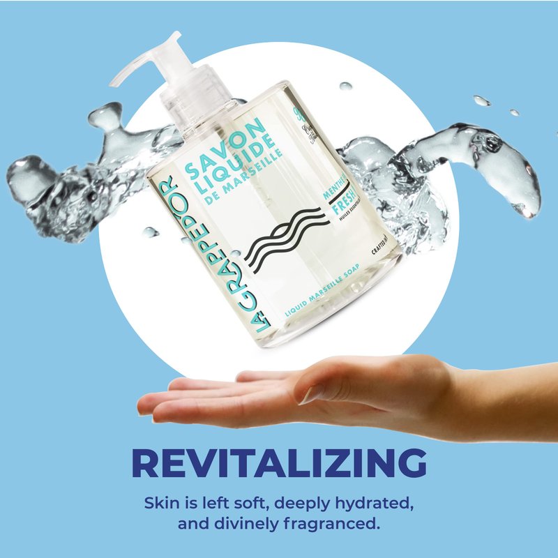 Responsibly made in Provence, France from the finest of natural ingredients, La Grappe d'Or Liquid Marseille Soap is enhanced with aromatic essential oils creating a luxurious experience for the body. Made from Mediterranean organic olive oil and coconut oil, with naturally occurring glycerin of plant origin, it gently cleanses even the most sensitive skin. Free of gluten, parabens, sulfates, phenoxyethanol, phthalates, mineral oils, synthetic colors and never tested on animals. The natural exfoliating properties result in an ultra-pleasant sensation. Skin is left soft, deeply nourished, and richly fragranced. Offered in five premium scents: - Fresh Mint - Mediterranean Fig - Rare Sandalwood - Fresh Canna - Royal Bergamot La Grappe d'Or Liquid Marseille Soap makes for a thoughtful gift for yourself, dad, mom, and friends, for birthdays, events, bridal showers, weddings, and more. Suitable for frequent use. Can be used on the hands and entire body. Apply to damp skin, gently rub and rinse thoroughly.