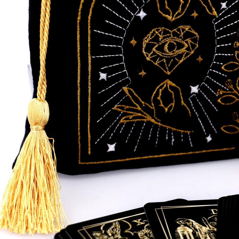 Crafted from plush purple velvet and adorned with enchanting black and gold embroidery, our tarot bags are designed to keep your precious decks protected in style. Finished with adorable gold tassels, these bags offer versatility beyond compare. Use them to safeguard your tarot cards or explore your creative whims. Additionally, these bags can be repurposed for storing jewelry, crystals, or other small treasures. Elevate your tarot experience with our exquisite tarot bags, perfect for multiple purposes.