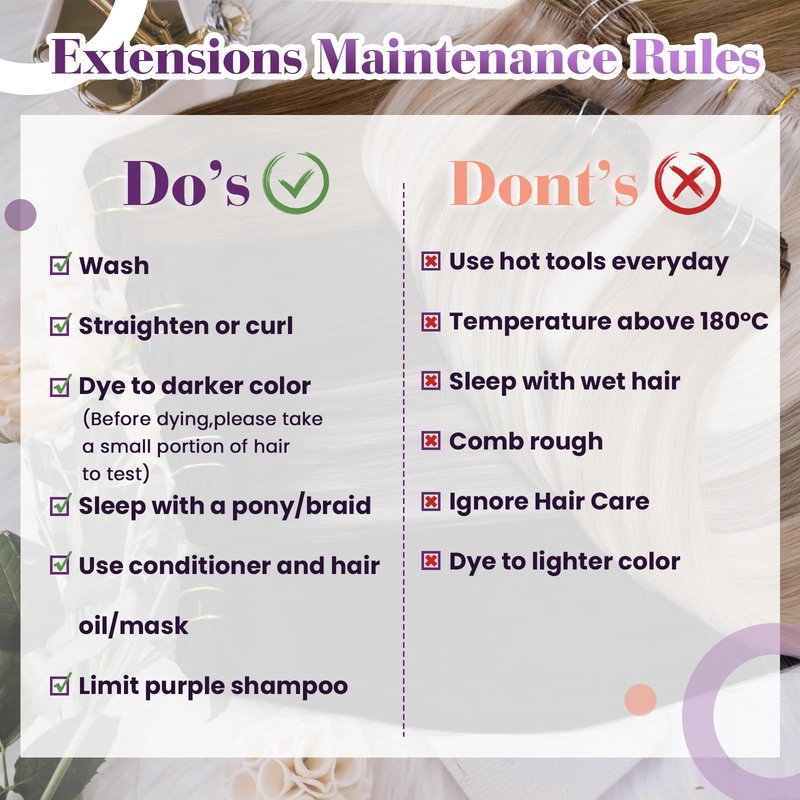 - [Maintenance and Care] To ensure the longevity and durability of your hair extensions, proper maintenance is vital. Avoid excessive heat styling, use gentle products(staining occurs when using purple shampoo), and store them with hair extensions storage bags when not in use. Please do not bleach your LaaVoo human hair extensions. Because LaaVoo hair extensions have undergone dyeing and other treatments, further bleaching or lighter dyeing will damage the hair quality and shorten its lifespan.