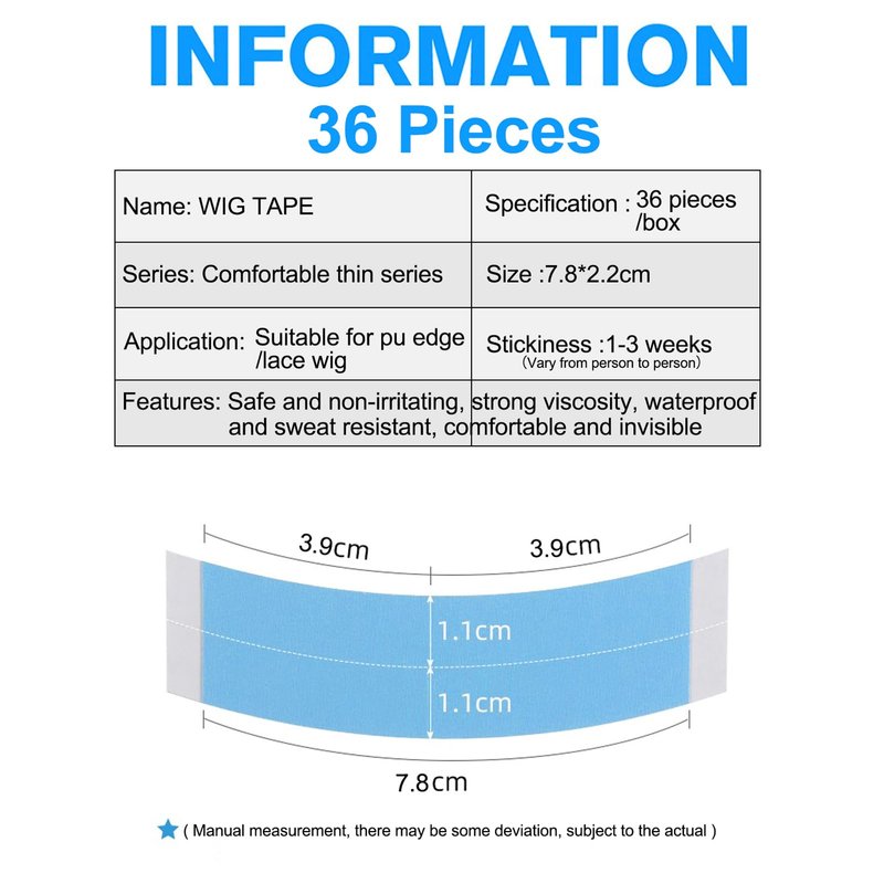 Wig tape is suitable for all types of wigs, wig tape has super adhesive, do not worry about the tape easy to fall off. Suitable for men and women Before use, you need to wipe the skin that needs to be pasted, and then paste the blue side on the wig, the white side on the skin, and gently press it. Our wig tape has good water resistance, after use, you can still swim, bathe, sleep and other outdoor activities. Product Specifications: Quantity: 72 tablets/box Color: Blue Tape color: transparent Size :7.8*2.2cm
