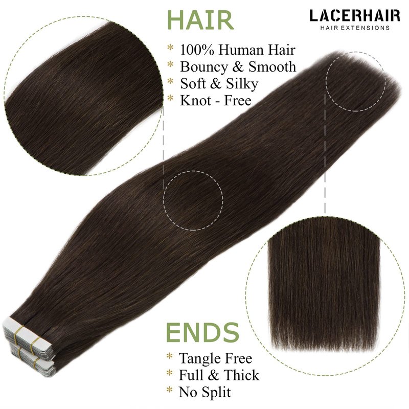 Lacer 16 Inch Human Hair Extensions Tape in Dark Brown Seamless Double Sided Skin Weft Invisible Black Hair Extensions Human Hair Tape in 50g/pack 20pcs