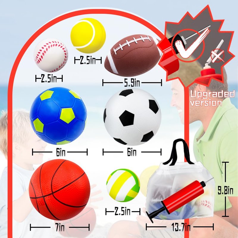 - KIDS LOVE SPORTS TOY BALL SET: Basketball (7in), soccer (6in), rugby (5.9in), volleyball (4.7in), baseball and tennis (2.5in) Contains 1 air pump and storage bag. Quick to inflate and easy to carry.