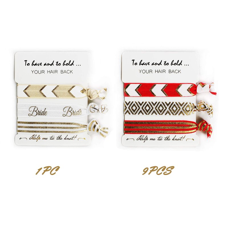 - BRIDE TRIBE GIFTS -Total 10 packs hair ties, 1 white pack for bride, 9 pink pack for bride tribe. There are 3 different hair ties for each pack.