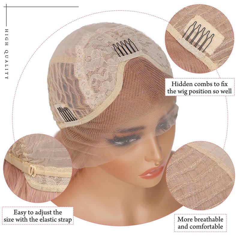 - [👑Comfortable to Wear] The ash pink lace front wig has breathable rose net cap and that will make you feel comfortable when you wear it. You can’t see any of the cap or wefts underneath. And this pink lace front wig has adjustable straps to fit most size/shape heads, average fit 21-23 inches head circumference.