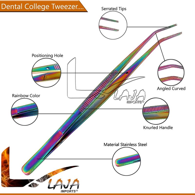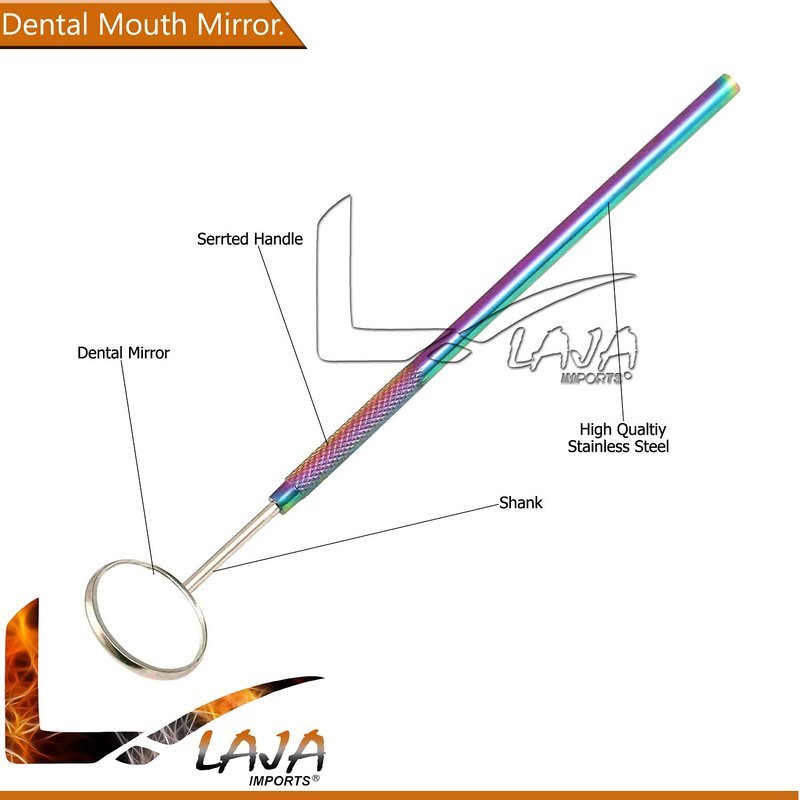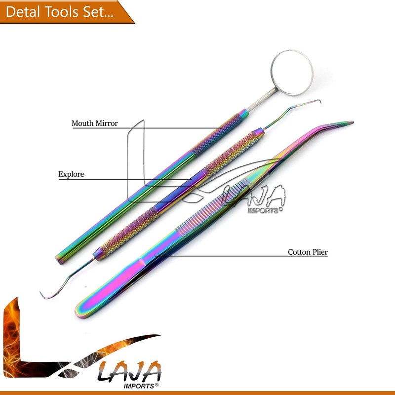 LAJA IMPORTS Dental Hygiene Set - 3pcs Basic Dental Instruments Stainless Steel Dental Tooth Pick, Mouth Mirror ,Cotton Plier - Dentists Tools Set Is Ideal For Personal Use & Pet Friendly Rainbow Tita