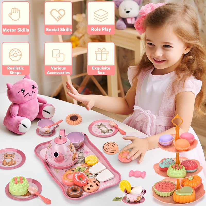 - 【Unleash Imaginative Play】Embark on a whimsical journey into imaginative play with the Lajeje 49-piece cat-themed tea set. Complete with a charming tin teapot, tin cups, saucers, plates, and BPA-free plastic desserts, your child's tea parties will radiate enchantment! Transport the enchantment wherever you go using the included cardboard carrying case.