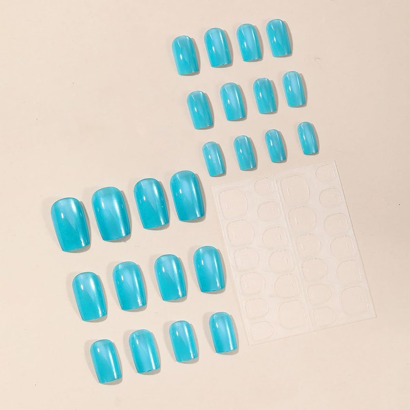 Lake Blue Cat Eye Press on Nails Medium Square SWEKKE Fake Nails Full Cover Jewelry Blue Glossy Glue on Nails