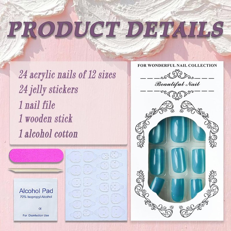 - 【Healthy and Durable】The blue cat eye fake nail are made of ABS material, which is environmentally friendly, non-toxic and odorless. They are resistant to chipping and fading, ensuring a flawless look throughout the day and night,Durable enough to last 1-3 weeks. It lasts longer if you use own glue.