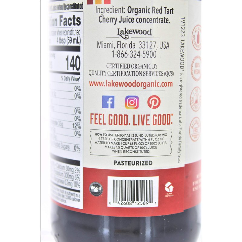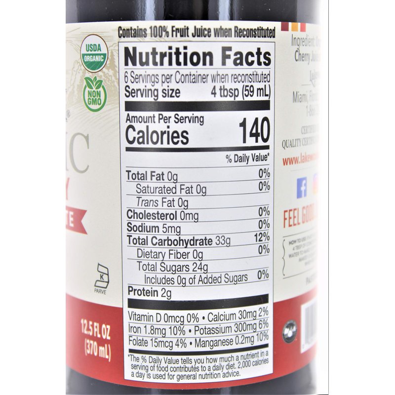 Lakewood organic tart cherry concentrate packs the juice from over 3 lbs. Of cherries into each bottle to create a 100% juice drink when reconstituted with 36 ounce of water. Our unsweetened juice is free of allergens, additives, preservatives, casein and gluten, making it an appropriate choice for people with certain food sensitivities. We package 12.5 fl oz of tart cherry concentrate in a nontoxic glass bottle free of bpa, bps and dehp, and each reconstituted serving contains 140 calories.