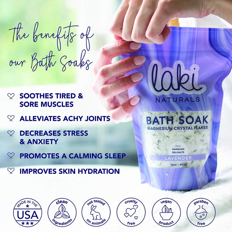 Relax and unwind naturally with Laki Natural’s bath soak. A therapeutic blend of minerals, this bath soak absorbs deep within the skin to help reduce stress, ease muscle tension, and promote sleep.