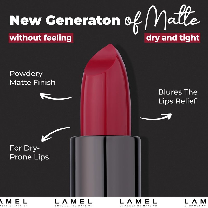 Discover the perfect blend of comfort and style with LAMEL Make Up's Powder Drop Matte Lipstick. This creamy matte formula is designed to deliver a comfortable wear without the tightness or dryness associated with traditional matte lipsticks. Elevate your makeup routine with this long-lasting beauty essential that offers a flawless finish. The noble shades not only accentuate the beauty of your lip shape but also feature unique pigments that securely lock in the color, ensuring a stunning look that lasts all day. Encased in a beautiful minimalist packaging, this lipstick is not just a makeup product; it's a fashion statement for your makeup bag or dressing table.