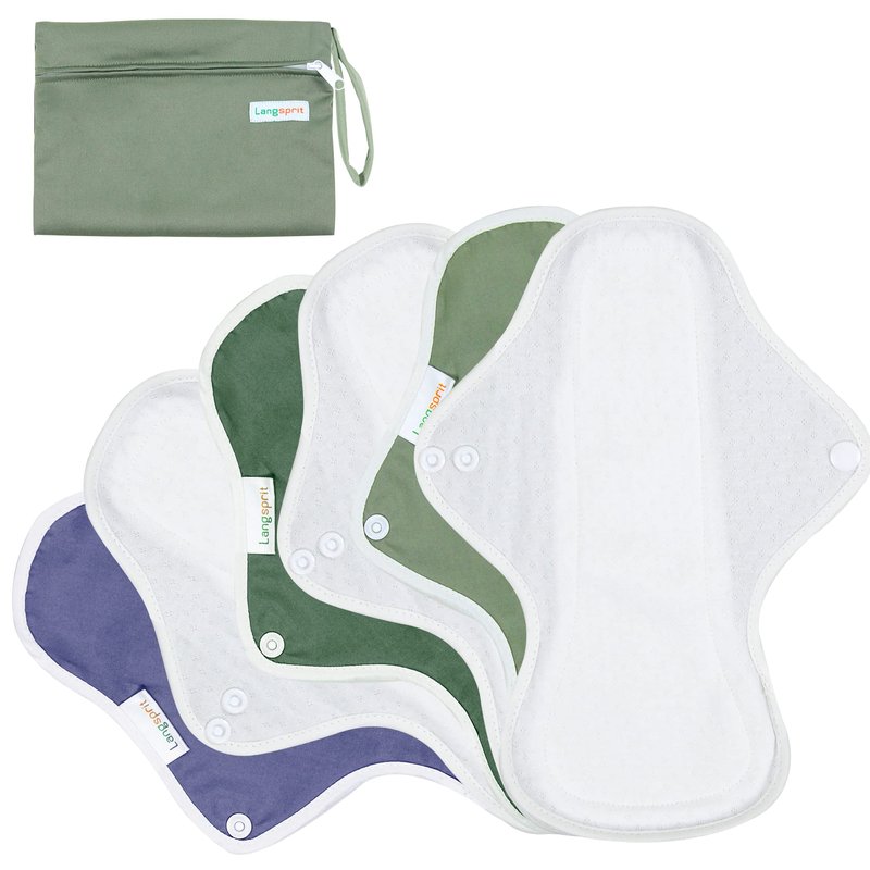 Langsprit Reusable Sanitary Pads for Women, Feminine Pads for Women Regular Absorbency Cotton Washable Cloth Menstrual Pads 6pcs Set with Mini Wet Bag Leakfree and Periods (Medium)