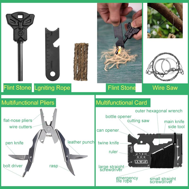 - Prepared for Any Emergency: Survival Kit Included Emergency Equipment that are suitable for Outdoor Survival like Camping, Hiking, climbing and so on, which fit your need when the unexpected conditions or emergency happens.