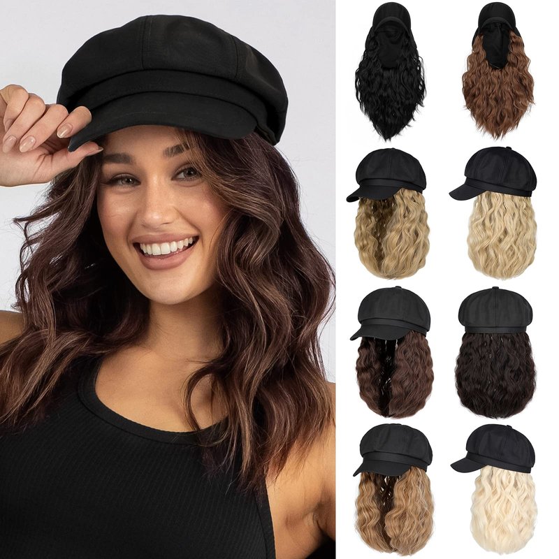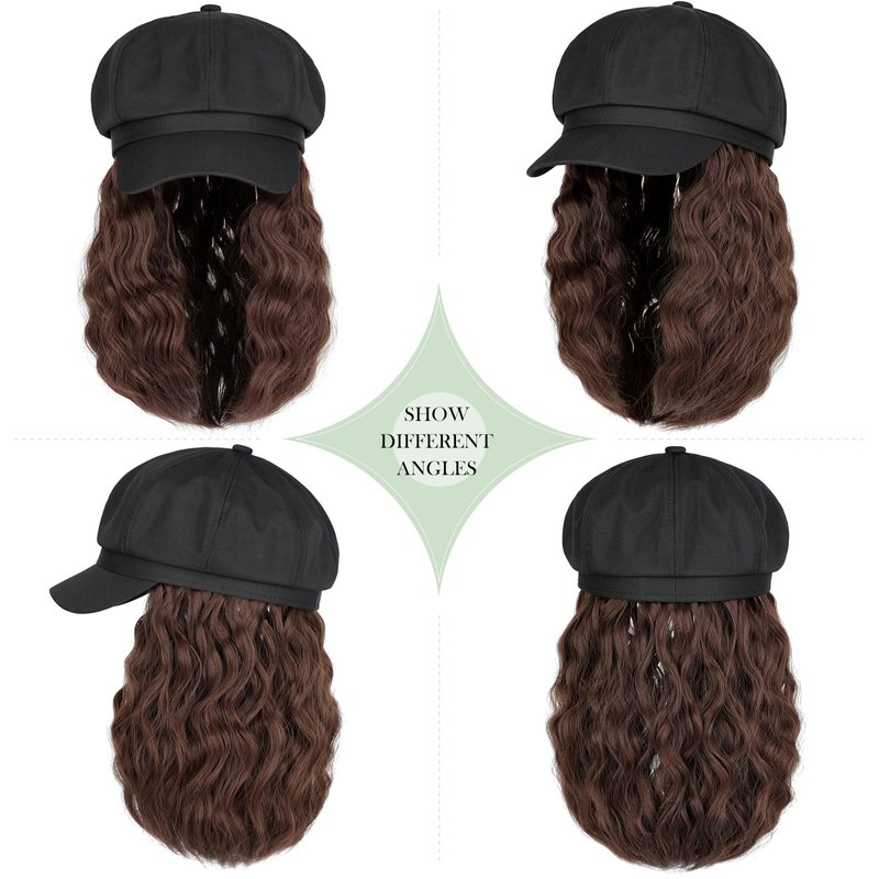 Lansigreen Newsboy Cap with Hair Extensions Short Curly Wavy Bob Hairstyle Wig Hat Beret 8 Panel Attached 14" Synthetic Hairpiece for Women Medium Brown