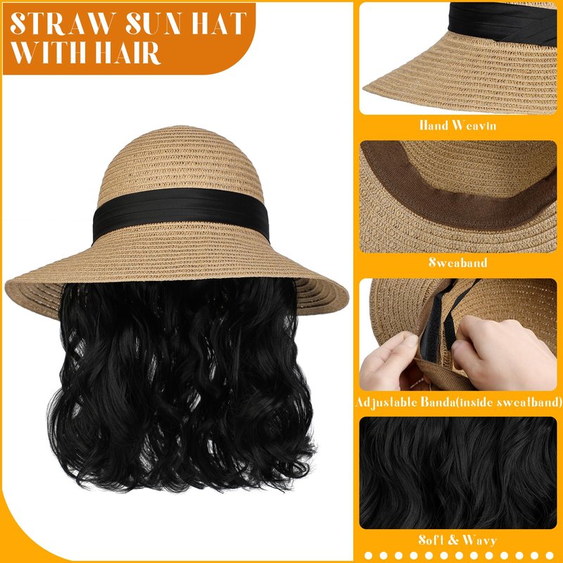 Lansigreen Sun Hat with Hair Extensions Hat Wig UPF 50+ Foldable Wide Brim Straw Beach Hat Attached 9" Wavy Hairpiece Synthetic for Women Summer Dark Black