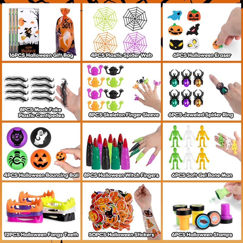 - RICH VARIETY HALLOWEEN TOYS: Halloween party favors for kids are new and interesting,including simulated fake centipedes, skeleton finger sleeve, halloween witch fingers,halloween fangs teeth,bat,halloween pull back car,pumpkin ball toys,halloween bouncing ball, etc. The variety halloween gifts for kids of halloween party supplies set is enough for everyone to find something they like.