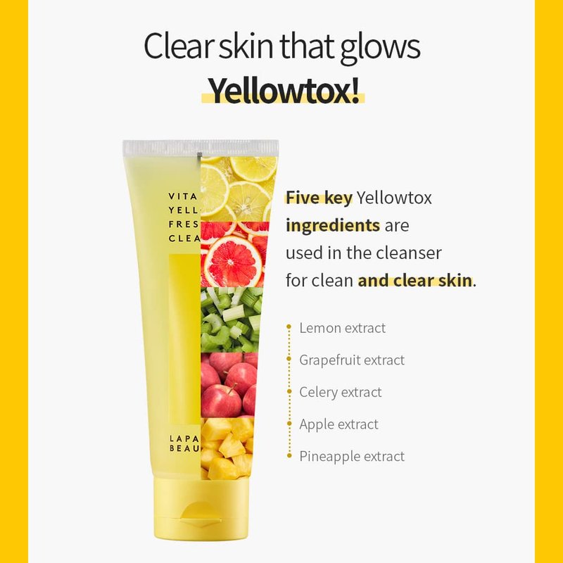 - VITA YELLOW FRESH CLEANSER WITH FIVE KEY YELLOWTOX INGREDIENTS: Lemon, Grapefruit, Celery, Apple, And Pineapple Extract For Clean And Clear Skin.