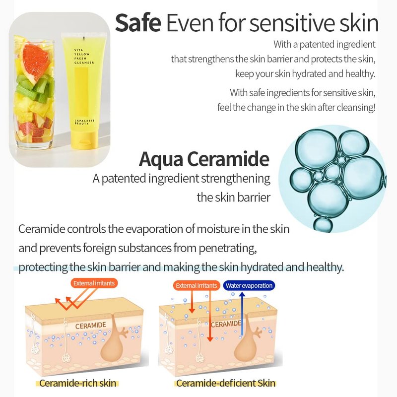 #01 Moisturizing 1-step cleanser with 88% moisturizing essence - Healthy cleanser developed with fresh prescription. - A one-step cleanser that removes all skin wastes and point makeup at once. - Skin cleansing more safely using 100% natural surfactant. - Jelly-type cleanser contains 88% moisturizing essence, which moist even after cleansing. - Hydrogelicacid moisture coating as soon as it touches the skin #02 Increase YellowTOXingredients by 200% - Compared to season 1, contains 200% more YellowTOX! (lemon/grapefruit/salary/apple/pineapple extract) - Bright skin that shines transparently with skin detox effect #03 Pure Vitamin C + Natural Vitamin C + Patent Ingredient - Pure vitamin C and Indian gooseberry extract manage with a smooth skin texture. - It contains Aqua Ceramide, a patented material, to strengthen the skin barrier. *LAPALETTE BEAUTY PROMISE : Dermatologist tested, Clean Beauty, Cruelty-free, Parabens-free, Synthetic Fragrance-Free