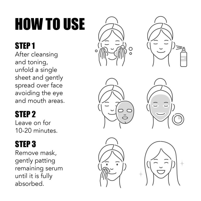 - HOW TO USE - Cleanse and tone your face. Unfold single use mask. Apply following the contours of your face, adjusting around eye and mouth area. Leave on for 10 - 20 minutes. Remove mask and gently pat face to absorb remaining essence into the skin